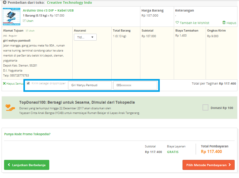 - pastikan semua data bernar (alamat, jumlah, dan nomor telepone) lalu centang pilihan dropship dan isikan data kalian