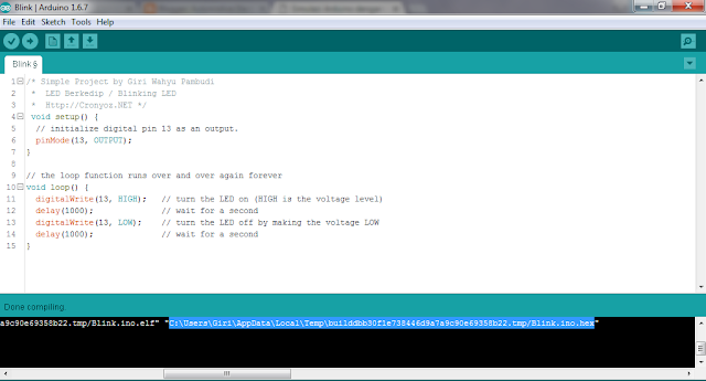 Assalamu’alaikum Pengunjung Setia Cronyos.com, Kali ini saya akan membagikan Tutorial Cara Mendapatkan File HEX dari Arduino IDE, berbeda dengan CodeVision AVR dimana File HEXnya langsung bisa didapatkan, Arduino IDE agak berbeda, dimana File HEXnya tersembunyi. 🙂 berikut cara mengetahui lokasinya :