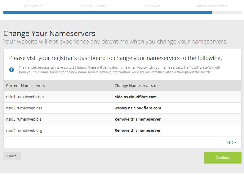 nah sampai disini urusan kita dengan rumah web selesai, silahkan kembali lagi ke tab cloudflare kalian pada langkah nomor 6 lalu klik continue, dan kalian akan masuk beranda cloudflare,