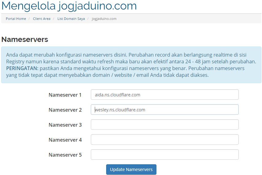 Setelah itu ganti name server seperti perintah dari cloudflare pada langkan nomor 6, lau klik “Update Name Server”