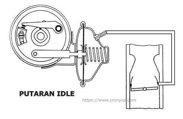 Pada kondisi ini kevakuman intake manifold belum terhubung dengan vakum advancer sehingga vakum advancer tidak bekerja (tidak terjadi pemajuan timing)