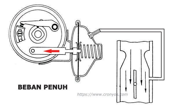 Saat beban penuh maka kevakuman intake manifold yang menuju vacum advancer rendah, sehingga vacum advancer kembali ke posisi semula (timing pengapian mundur)
