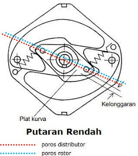 Pada saat putaran rendah, tidak terjadi pemajuan timing pengapian, karena poros distributor dan poros rotor masih berhimpit