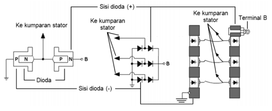 Berdasarkan gambar di atas, tampak bahwa dua buah dioda dihubungkan secara seri sehingga terdapat tiga pasang dioda yang dihubungkan secara seri. Kaki anoda pada sisi dioda negatif digabungkan satu sama lain dan dihubungkan dengan massa, sedangkan kaki katoda pada sisi dioda positif saling dihubungkan juga dan dihubungkan dengan terminal B. Ujung -ujung kumparan stator disambungkan dengan bagian tengah di antara pasangan dioda yang dihubungkan seri. Berikut ini dijelaskan proses penyearahan arus AC yang dihasilkan oleh kumparan stator.