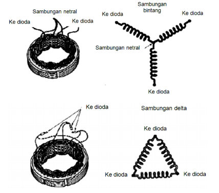 Sambungan delta kumparan stator dapat diidentifikasi dengan mudah karena pada kumparan jenis ini hanya mempunyai tiga ujung kumparan stator yaitu ujung kumparan yang ketiganya dihubungkan dengan dioda penyearah